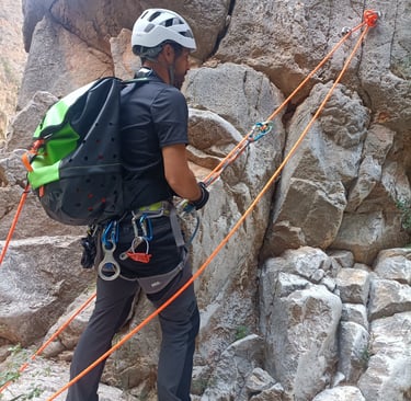 V4: Rápeles de hasta 40 m, instalaciones colgadas o con acceso delicado, destrepes expuestos.