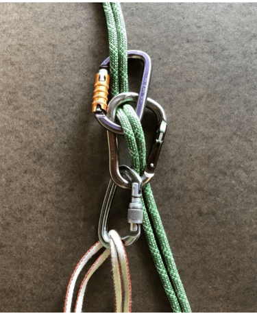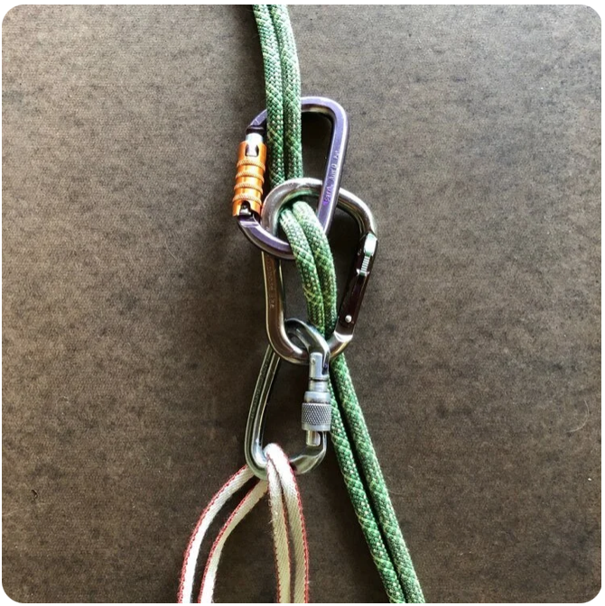 ⚠️ Existe la posibilidad de que el roce de la cuerda pueda abrir el cierre de algún mosquetón, por lo que debes estar atento a esto. Si utilizas mosquetones con cierres automáticos de doble o triple acción, reducirás la posibilidad de que ocurra esto.